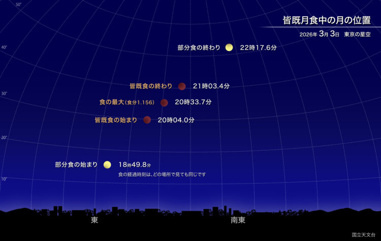 今年最大の天文イベントは、なんといっても2026年3月3日宵の時間帯に見られる皆既月食です!