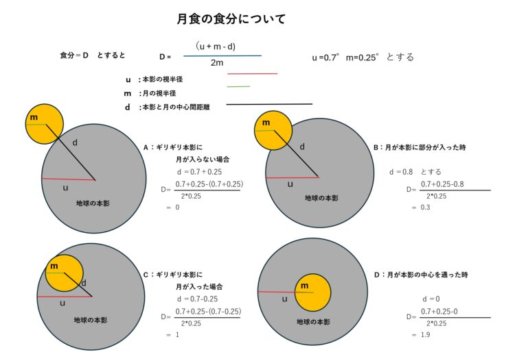 この図の計算式により計算される値が 1以上の場合が「皆既月食」となり、1に満たない場合は